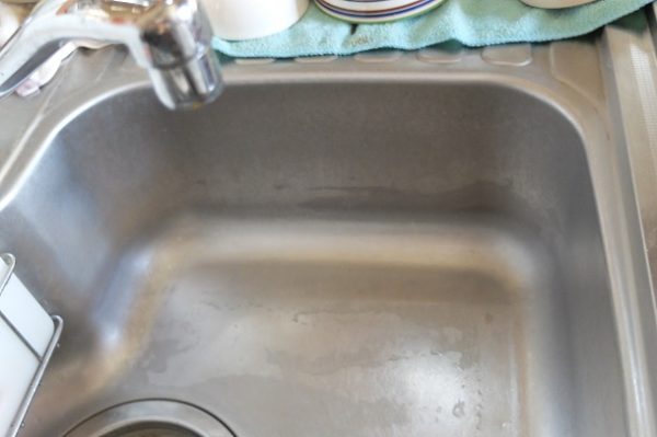 食器を洗ったあと、シンクも最後に洗って水滴を布巾で拭いて…という流れですが、シンクが乾くとぼやーっと白っぽく浮かび上がってきます。