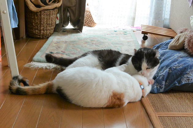 でも猫は必ずしも涼しいのが好きでは無いらしく、部屋から出てフローリングの床で寝そべってる方が良いらしいですが。