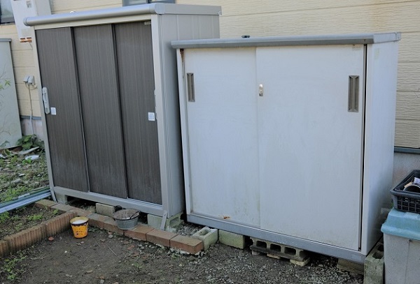 左側のガルバリウム物置を買うまでは重宝して使ってましたが、錆がでて汚くなってきた。