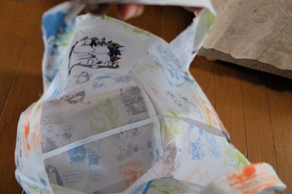白い方は少し手を加えて、マチを広げて弁当用バックにしてみました。