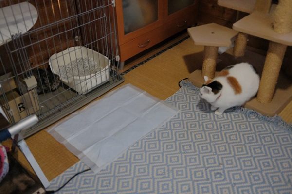 というわけで子猫は今、部屋の中でケージに入ってユズがずーっと見張り番です。めっちゃ興味があるようですよ。
