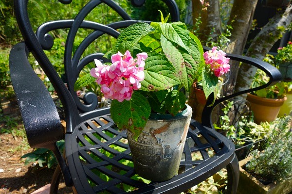 「霧島の恵み」という、秋まで次々咲くアジサイで新品種だけど、真夏の日差しは苦手らしい