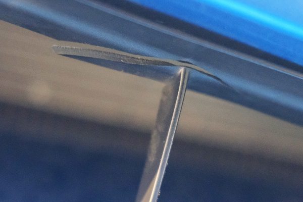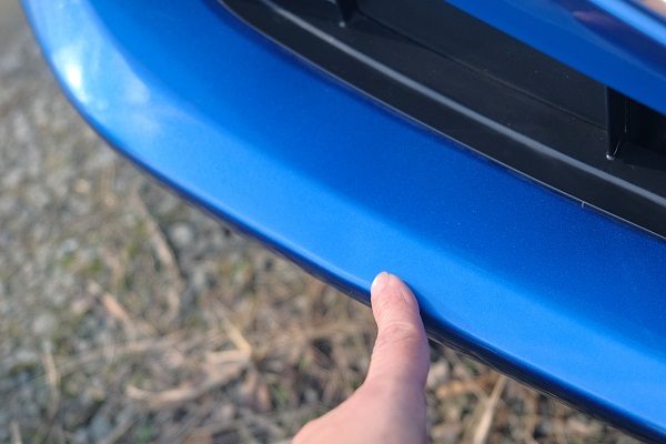 バンパーに組み込まれた黒い樹脂のパーツが外れ、一部破損してます。