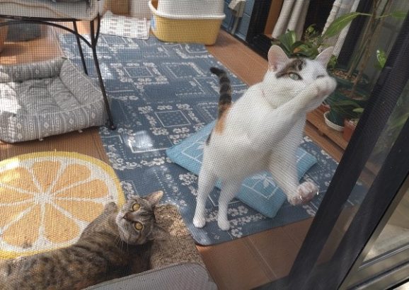外で作業してる飼い主をしっかり見張ってる猫ら。