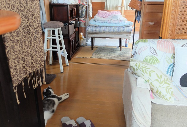 猫のペットシートに半分占領されてるため、ワタシの寝るスペースは半分が和室で半分は玄関前の板の間にはみ出て布団を敷いてます。