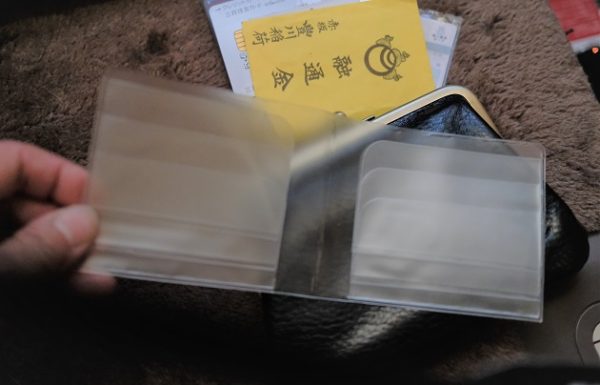 クレジットカードとキャッシュカードは磁気付きなのでそのまま重ねたらマズイので、コンパクトに畳めるクリアカードケースを利用しました。