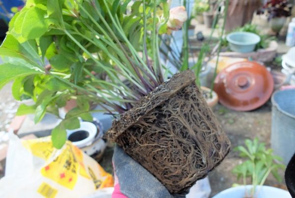 包丁でざっくり切って、分けてから根をほぐし植え替えをする。