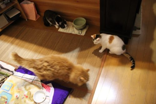 例えばご飯を二日分用意して外泊するとしたら、若猫がガッついてしまい、すぐ全部たいらげてしまいます。