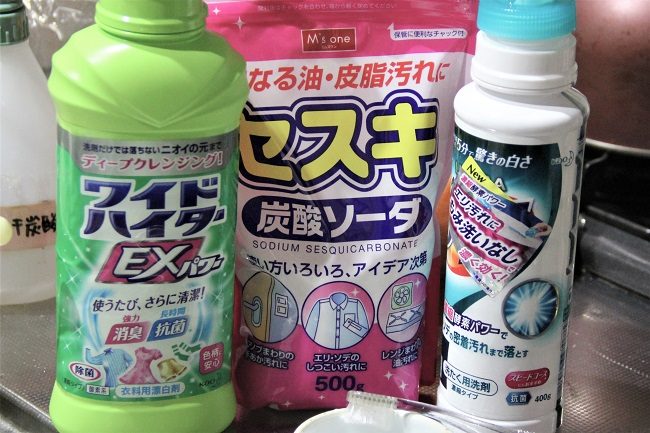 酸素系漂白剤とアルカリ系洗剤もしくはアルカリ系漂白剤なら何でも良いそうで、これらを混ぜると強力なシミとり剤になるんだとか。それと洗剤と混ぜて古歯ブラシで原液を塗り付けしつこく叩き込む。洗剤は台所洗剤なんかもいいそうですよ。