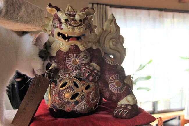 実家の古家の片づけ物で、どうにも処分出来ずに一年以上も我が家の棚に飾っていた古い陶器の置物がありました。有田焼の置物なんですが、「玉乗りの狛犬」というのかな?