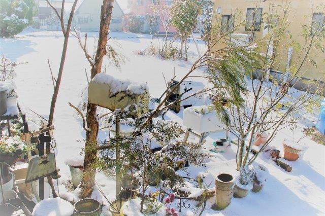 鉢植えは玄関土間に入れたけど、大鉢はそのまま。まさか凍って死んだりして無いよね?バラの鉢が心配です。