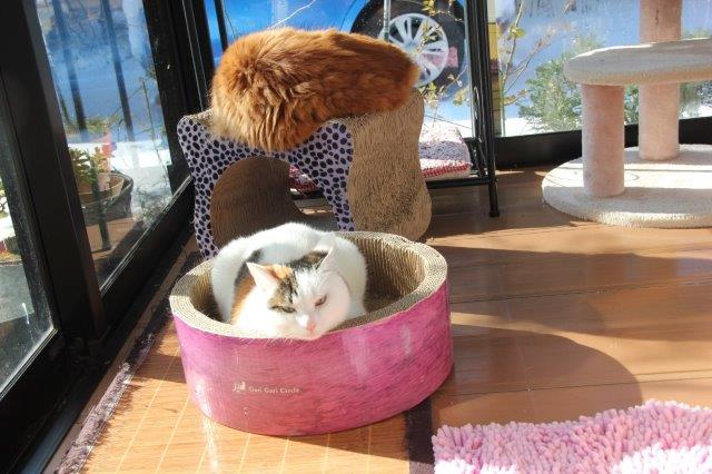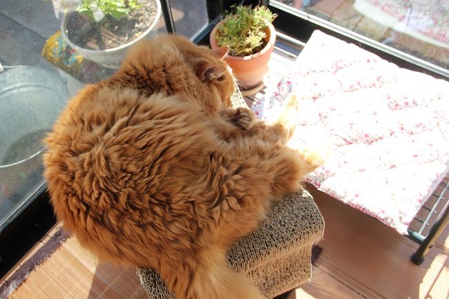 それにしても、こんな爪とぎの上で、ぐっすり眠れるのが不思議です。寝ながらしがみついてる時もあるし、体がはみ出てたりと良く落ちないなと思う。。。