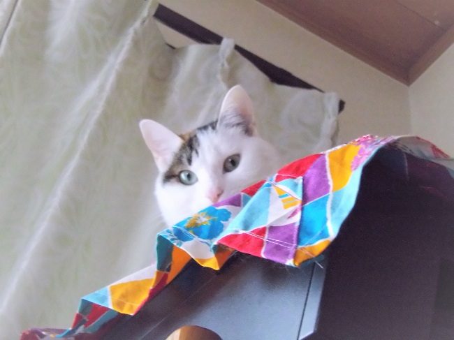 ジャンプが全部成功して、「ヤッター、ゆずヤッター」と叫んで興奮してたら、上の棚で寝てたウチのユズちゃんがワタシを見てた。