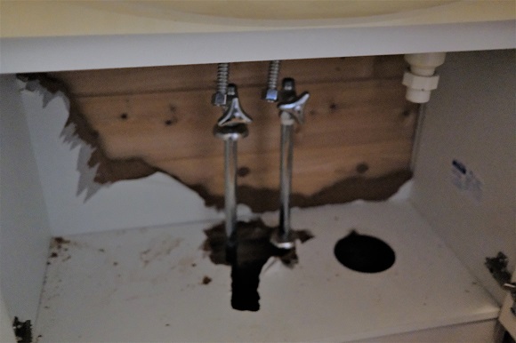 洗面台の背板、底板はほとんど化粧ベニヤで一部高級仕様でも樹脂パネルですから排水接続で排気漏れあると10年ぐらいで底板背板が腐食崩壊しますからしっかり頑張って接続して下さい。
