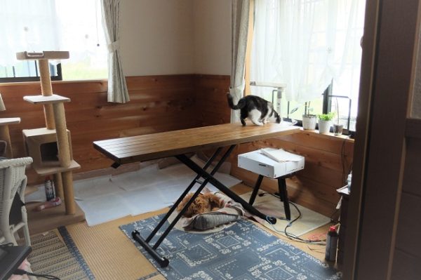 前の日もそうでしたが、何故か家具を動かしたり、ガタガタと作業をすると猫らが興味を持ってそばに寄って来ます。多分飼主が遊んでいると思ってるらしい…