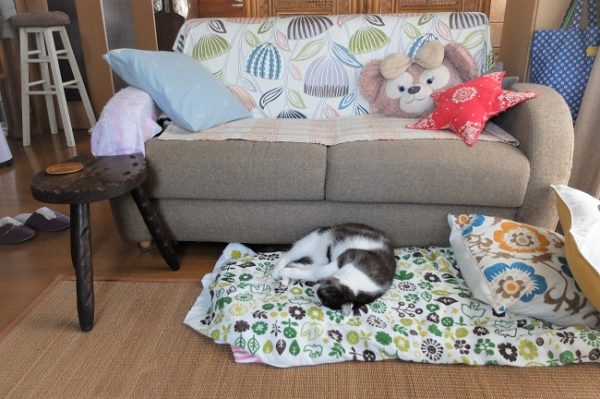 気分転換になって、掃除も出来たしたまには模様替えするのもいいですね。枝になってるのはウンベラータなんですが、ヒョロヒョロに伸びて乱れたので剪定したんです。今、芽が出てきている所です。 模様替えして、ソファーでゴロゴロし易くなりました 笑 猫は何故かソファー下で寝てるんですよ、猫が寝るということは、そこが快適なのかな? 今後ワタシも寝転がってみますわ。